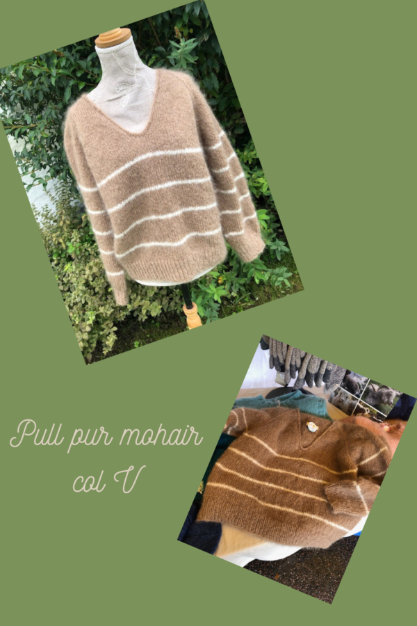 Kit à tricoter : explications fournies avec les pelotes , nécessite 7 pelotes de pur mohair en taille M et aiguilles n°4.5 , difficulté moyenne , tricoté en circulaire depuis le haut vers le bas